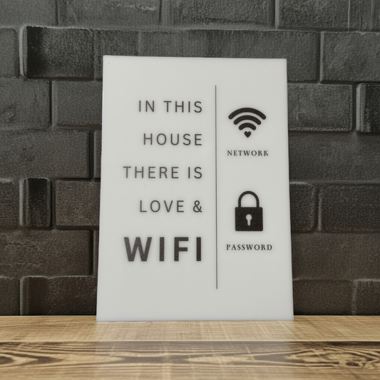 In this House There is Love & Wifi- WiFi Network and Password Sign. Acrylic 5"x7" with Easel and Double Sided Tape. White - Design 4