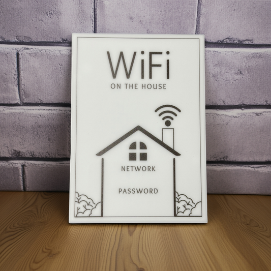 Wifi on The House - WiFi Network and Password Sign. Acrylic 5"x7" with Easel and Double Sided Tape. (White - Design 3)